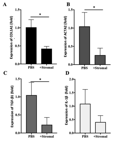 Effect of stromal cell exosomes on the expression of fibrotic markers in LX-2 cells. Non-activated LX-2 cells were cultured in the presence (+Stromal) or absence (PBS) of exosomes isolated from stromal cells for 2 days. Total RNA was isolated from LX-2 cells, and the relative expression of COL1A1 (A), ACTA2 (B), TGFβ1 (C), or IL-1β (D) was quantified by qPCR. The relative expression of each gene in the presence of exosomes was normalized to that of control (PBS), which was set as 1. Data are presented as mean ± SD (n = 3). * p < 0.05.