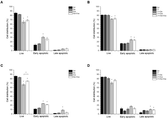 The effects of Ola, Oxa and LY on MDA-MB-231 (A,B) and MCF7 (C,D) cell apoptosis were detected by MUSE Cell Analyzer using MUSE Annexin V and Dead Cell Kit after 72 h treatment with 2 µM olaparib, 25 µM oxaliplatin, 1 µM LY294002 alone and in combination. Results are shown as mean ±SEM of at least three separate experiments. * p < 0.05 compared with the untreated cells. Ola—olaparib; Oxa—oxaliplatin; LY—LY294002.