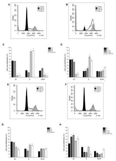 Flow cytometry analysis of MDA-MB-231 (A–D) and MCF7 (E–H) cell-cycle distribution. Cells were cultured and treated for 72 h with 2 µM olaparib, 25 µM oxaliplatin and 1 µM LY294002 alone and in combination. The cell-cycle distribution was determined with propidium iodide staining. The histograms show cell-cycle phases of control cells (A,E) and cells treated with combination of olaparib, oxaliplatin and LY294002 (B,F). The bar charts represent effect of single and combined treatment on cell cycle phase distribution (C,D,G,H). Results are expressed as mean ±SEM of at least three separate experiments. * p < 0.05 compared with the untreated cells.