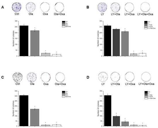 Effects of Ola, Oxa and LY on colony formation by MDA-MB-231 (A,B) and MCF7 (C,D) cells. Cells were seeded in six-well plates and after one day treated with 2 µM olaparib, 25 µM oxaliplatin, 1 µM LY294002 alone and in combination. Cells were treated for 14 days before being stained with Coomassie Blue. Results are shown as mean ± SEM of at least three separate experiments. * p < 0.05. Ola—olaparib; Oxa—oxaliplatin; LY—LY294002.