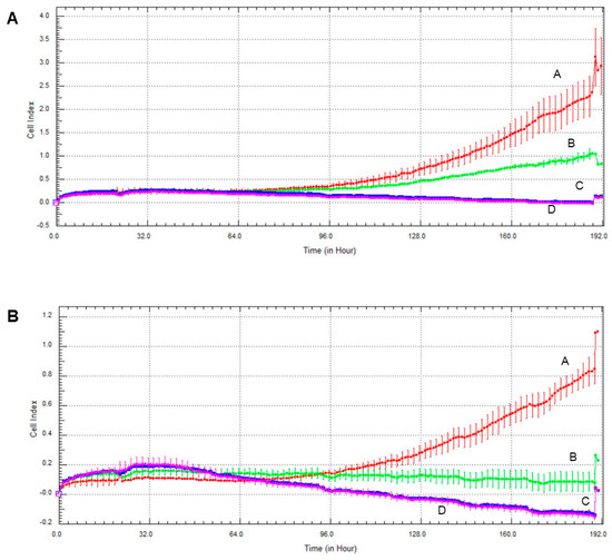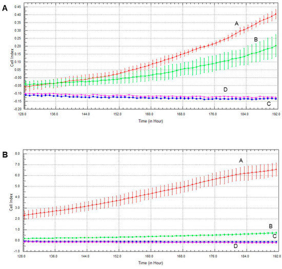 Effect of olaparib and oxaliplatin on invasive growth of MDA-MB-231 (A) and MCF7 (B) cells treated with 2 µM olaparib and 25 µM oxaliplatin. Line A—control, Line B—2 µM olaparib treatment, Line C—25 µM oxaliplatin treatment, Line D—combination treatment.