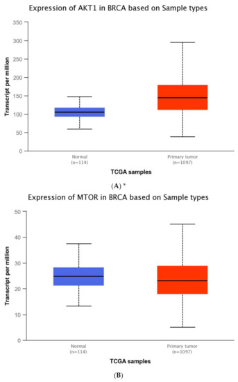 The conducted analysis the data available on international database TCGA using the Kaplan–Meier Plotter (web source the Ualcan) showed that no clear relation between expression level of the studied genes and breast cancer patients survival-AKT1 (p = 0.44), MTOR (p = 0.79), PIK3CA (p = 0.14), PIK3R1 (p = 0.48), PTEN (p = 0.25) (Figure S6).