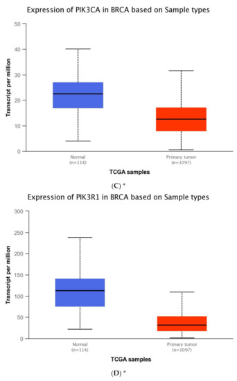 Using the bc-GenExMiner web source, we analyzed the expression of the studied genes depending on the clinical parameters (age, ER, PR, HER2 and node status). Analysis of data in the TCGA database showed statistically significant differences between the expression of selected genes and with the following clinical parameters: ER status-AKT1 (p = 0.0004), PIK3CA (p = 0.0285), PIK3R1 (p = 0.0039) and PTEN (<0.0001); PR status-PIK3R1(<0.0001), PTEN(<0.0001); HER2 status-AKT1 (p = 0.0002), PTEN (p = 0.0227) nodes status-PIK3R1 (p = 0.0228) (Table 4, Figures S1–S5). Differences between our results and those contained in the TCGA database may result from a relatively small group of patients participating in our study. Differences may also result from the dissimilarity of the surveyed group (the population comes from Poland). Therefore, there is a need to confirm them in an independent cohort of patients.
