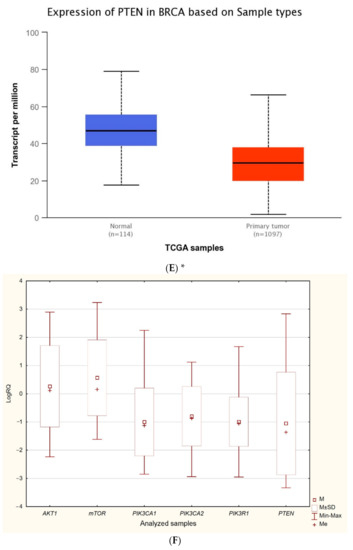 Differences between the expression level of the genes within the PI3K/Akt/mTOR pathway in normal tissues and breast cancer in the TCGA samples: AKT1 (A), MTOR (B), PIK3CA (C), PIK3R1 (D), PTEN (E) (web source the Ualcan) and in analyzed samples (F) * p < 0.05.