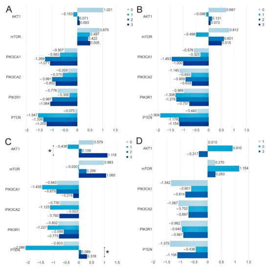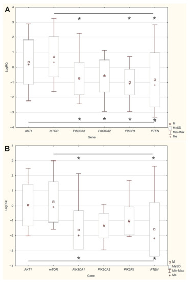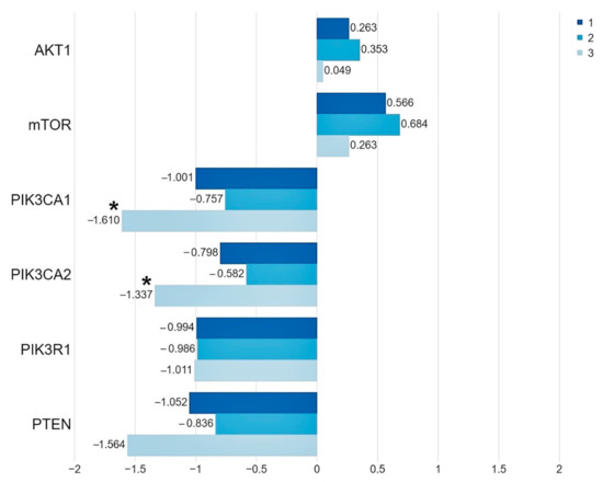 The mean expression level (expressed in logRQ) of the studied genes related to the PI3K/Akt/mTOR pathway in the: (1) entire studied group; (2) in the group of patients without mutations; (3) in the group of patients with mutations * p < 0.05.