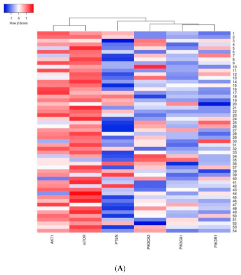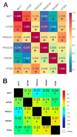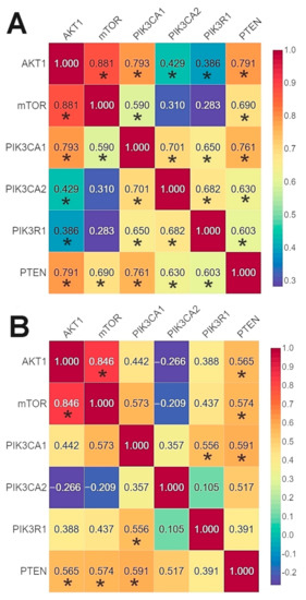 The results of the correlation analysis showed a statistically significant correlation between all genes except for PIK3CA (2) and mTOR. Using the bc-GenExMiner web source, we conducted a correlation analysis of the data available on the TCGA database between the studied genes. The analysis confirmed the existence of statistically significant correlations between all the studied genes except for AKT1 and PIK3R1 (Figure 5, Tables S10 and S11, Figures S7–S16).