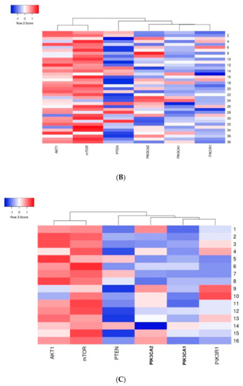 The first group of genes which indicated a strong relation with one another included the AKT1 and mTOR genes–a strong dependency between these genes was observed in all analyzed cases. The second group included the PIK3CA, PIK3R1 and PTEN genes where the relation between the studied genes was weaker than in the first group (Figure 7).