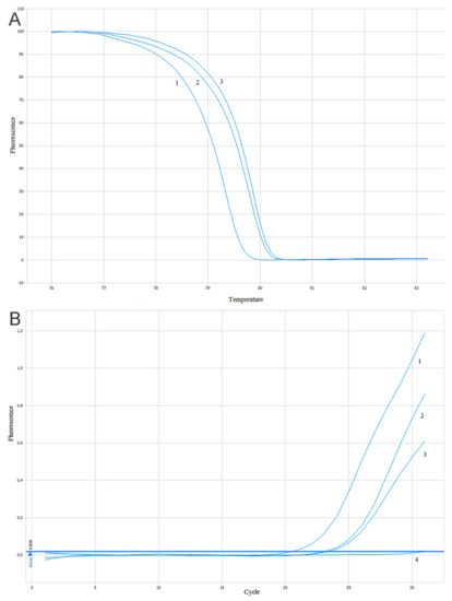Sample analysis of the results of the High-Resolution Melt PCR (HRM-PCR) and Allele-Specific-quantitative PCR ASP-qPCR reactions: (A) analysis of the melting curves of the HRM-PCR reaction products for the PIK3CA gene. 1. Negative control. 2. Studied sample. 3. Positive control; (B) analysis of the ASP-qPCR reaction product amplification for the PIK3CA gene. 1. Negative control. 2. Studied sample. 3. Positive control. 4. Negative DNA control [57].
