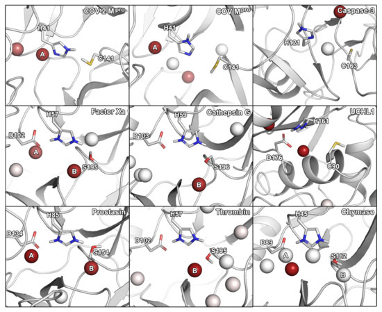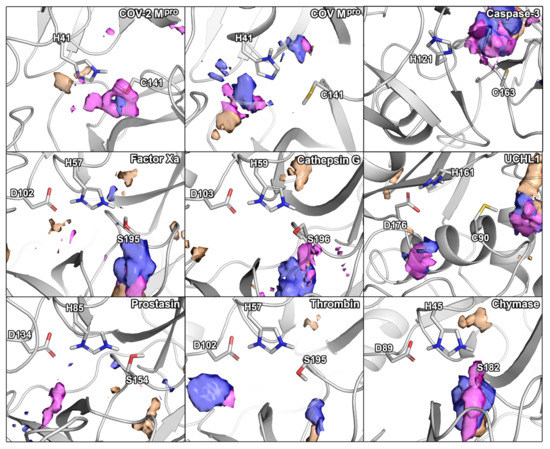 In the next step, we further characterized and compared the selected proteases according to their hydration and small-molecule hot-spots by using different molecular probes including water, acetonitrile, isopropanol, and pyridine. The  use of specific functional groups represented by the different organic probes associating with the active sites can be used to fine-tune the selectivity profile of protease inhibitors [18,28]. Similarly, selectively targeting hydration sites occurring in one protein, but not in an anti-target, offers potential to be exploited in structure-based design. It should however be mentioned that whether the displacement of water molecules is favorable or not depends on the thermodynamic profile of the respective hydration site [29], which was not assessed in this work. The  comparison of the hot-spots in the vicinity of the active site residues revealed distinct similarities (Figure 1).