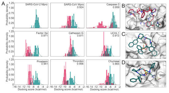 Figure 4. (A) Score distribution of SARS-CoV-2 Mpro inhibitors docked to the selected panel of proteases. The compounds designed against SARS-CoV-2 Mpro are shown in pine green, while the known actives for the remaining targets are shown in red. ROC AUC values with the SARS-CoV-2 Mpro inhibitors regarded as decoys for every target are shown. (B) Binding mode of compound 32 (red) and compound 14 (pine green) toward SARS-CoV-2 Mpro. (C) Binding mode of compound 199 toward cathepsin G. (D) Binding mode of compound 177 toward thrombin.