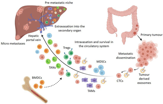 In order to successfully colonise distant organs, circulating tumour cells must be able to survive in the circulation, infiltrate into distant tissue, evade immune defence systems, adapt to diverse niche environments, and survive as latent ‘seeds’ that eventually break out and colonise the secondary tissue [40]. The concept that the spread of cancer cells depends on the interaction of the cancer cell (seed) and the host organ (soil) has been studied extensively since the proposal of this theory and has resulted in the establishment of the notion that specific organs are predisposed to metastases in specific cancers, and that the cross talk between cytokine and chemokine signalling and tumour cells regulates metastatic colonisation in secondary organs [54]. The term ‘pre-metastatic niche’ refers to the microenvironment in the secondary organ that supports the colonisation of metastatic tumour cells by providing favourable conditions that change in the otherwise hostile environment of the secondary organ (Figure 1) [38,55,56,57]. This environment is created by the recruitment of tumour-associated macrophages (TAMs) and tumour-associated neutrophils (TANs), myeloid derived suppressor cells (MDSCs), and regulatory T cells (Tregs) to the secondary site by cytokines, chemokines, and inflammatory factors from the primary tumour, which ‘prime’ the environment in the secondary organ before the arrival of circulatory tumour cells [38,55,56,57]. The formation of the pre-metastatic niche involves bone marrow-derived haematopoietic progenitor cells (BMDCs) that express VEGFR1 to form cellular clusters, promoting the upregulation of fibronectin in tissue resident fibroblasts to prepare the pre-metastatic site for the arrival of circulating tumour cells [58]. Colon cancer cells secrete VEGF-A, which stimulates CXCL1 expression in the primary tumour by TAMs [59]. Elevated levels of CXCL1 recruit CXCR2 positive MDSCs to the pre-metastatic liver tissue and promote tumour cell survival and metastasis while evading host immune responses [59].