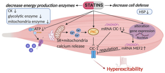 Representation of the major risk factors causing skeletal muscle impairment as found in statin-treated animal model [46,50]. Statins affect the activity and expression of ClC-1 chloride channel, a protein typically present in skeletal muscle and important for its function. Indeed, this channel controls sarcolemma excitability by stabilizing the resting potential, and preventing repetitive runs of discharges after the action potential. As shown, statins reduce ClC-1 gene and protein expression and increase that of the protein kinase C (PKC), which is known to induce phosphorylation and closure of the channel. PKC activation is also sustained by an enhancement of calcium release from the sarcoplasmic reticulum (SR) and mitochondria. This mechanism produces a decrease of resting chloride conductance (gCl), maintained by the ClC-1 channel, leading to a persistent hyperexcitability. It is likely that the modification of ClC-1 can be due to the observed increase of MEF2 (related to PKC activation and found to be increased during myotonia). Moreover, statin by reducing cholesterol, reduces coenzyme Q (CoQ) and ATP level. This reduction, together with reduction of glycolytic and mitochondrial enzymes, can be detrimental for skeletal muscle function. In addition, ATP reduction leads to the opening of ATP-sensitive potassium channels (KATP) as a compensative mechanism. This is complicated by a decrease of proteins responsible for cellular defenses against oxidative stress, for instance the heat shock proteins (HSP). All these new pharmacological targets may be attractive in the control of statin induced side effects in skeletal muscle. Arrows up and arrows down indicate an increase and a decrease, respectively.