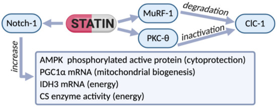 Translational studies focus on statin-induced side effects in skeletal muscle of patients in therapy and it is important to understand the causes of the harm. Based on our previous preclinical studies, we evaluated whether ClC-1 channel is modified in muscle biopsies of statin treated patients. We examined patients who experienced myalgia and other typical symptoms, such as hyper-CK-emia after starting statin therapy and we compared the results to those obtained in non-myopathic subjects not using lipid-lowering drugs. Importantly, the analysis of protein expression showed a 40% reduction of ClC-1 protein and an increase of phosphorylated PKC-theta in muscle biopsies of statin-treated patients with respect to untreated subjects, independently from their age and statin type. Real-time PCR analysis showed that despite reduction of the protein, the ClC-1 mRNA was not significantly modified, suggesting posttranscriptional modification (decrease of translation or protein maturation, increased protein degradation). In this regard, Murf-1 is increased suggesting protein degradation; MEF-2 and calcineurin (CN) mRNA were not increased suggesting that in humans they are less involved in ClC-1 expression, indeed ClC-1 mRNA was not modified [51]. GLUT-4 transporter was found to be reduced, suggesting alteration of glucose entry and energy insufficiency. However, the phosphorylated form of AMPK protein was increased, indicating the activation of compensative cytoprotective process [51]. In parallel, the expression of Notch-1, a gene implicated in the proliferation of muscle cells, was highly expressed in muscle biopsies of statin-treated patients, indicating effective regeneration. In this regard, it has been found that simvastatin was able to improve arteriogenesis, in case of stroke, particularly by regulating Notch-mediated signaling pathway [73]. Additionally, the expression of PGC-1-alpha and isocitrate dehydrogenase were increased as well as the activity of citrate-synthase (CS) suggesting the mitochondrial biogenesis [51,74]. Thus, in spite of the evident attempt of the muscle to counteract some of the statin-induced damage, it is not able to counteract the reduction of ClC-1 protein and consequent hyperexcitability of sarcolemma, as well as the energy production deficit that appears to be one of the most important troubles associated with statin-related risk of myopathy in humans. Accordingly, other studies showed reduced respiratory chain activity in mitochondria of patients [64]. A disturbance of the structural integrity of the muscle, with swelling, vacuolization and alteration of the transverse tubules (T-tubules) of sarcolemma was found [75], together with increased expression of the SR ryanodine receptor 3 (RYR3) and Ca2+ ATPase 3 (SERCA3) mRNAs [76]. Thus, the identification of a biomarker able to evidence myopathy is crucial to avoid therapy interruption and maybe to counteract statin-induced muscle damage. This study confirms the measure of ClC-1 expression as a reliable clinical test in muscle biopsies (when possible) to detect statin-dependent risk of myopathy (Figure 2).