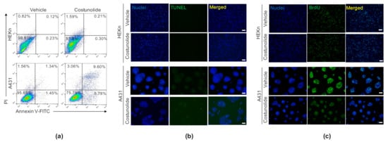 2.2. Costunolide Induced Apoptosis and Suppressed Proliferation in A431 Cells