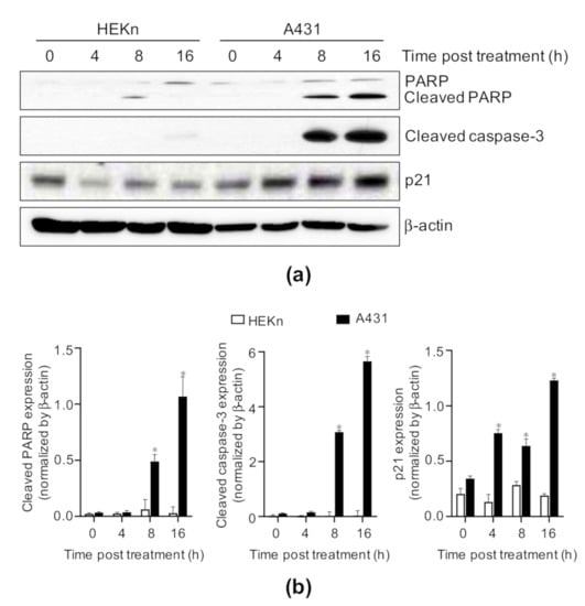 2.4. Costunolide Triggered Caspase-3 Activation, Poly-ADP Ribose Polymerase (PARP) Cleavage, and Increase in p21 Expression in A431 Cells