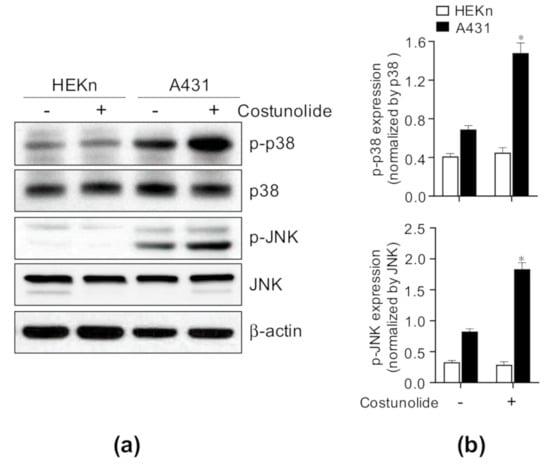 2.5. Costunolide Triggered Apoptosis via Activation of JNK and p38 Signaling in A431 Cells