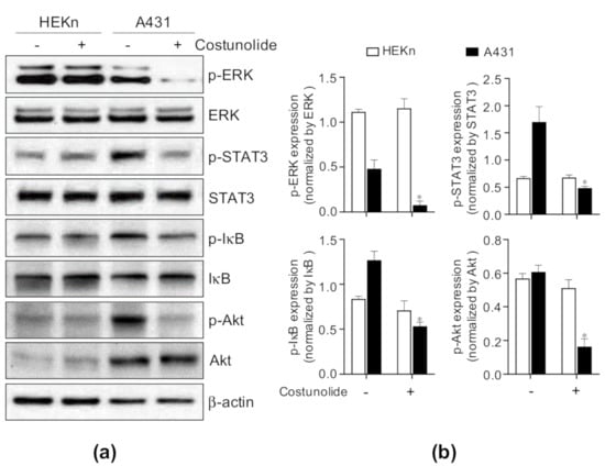 2.6. Costunolide Suppressed Cell Proliferation and Survival via Inhibiting ERK, STAT3, NF-κB, and Akt Activation in A431 Cells