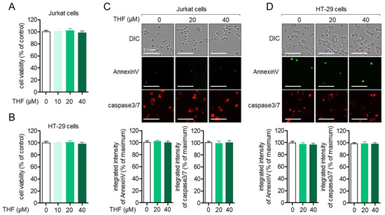 Seeded Jurkat cells (5 × 103/well, 96-well plate) or HT-29 cells (5 × 103/well, 96-well plate) were stained with staining reagents (AnnexinV and caspase3/7) and treated with the indicated concentration of THF (0, 20, or 40 μM) for 24 h. Images of cells were obtained using the IncuCyte® imaging system, and the intensity of Annexin V and caspase3/7 was also obtained. Integrated intensity of AnnexinV and caspase3/7 was calculated by comparing the intensity of control cells (% of control).