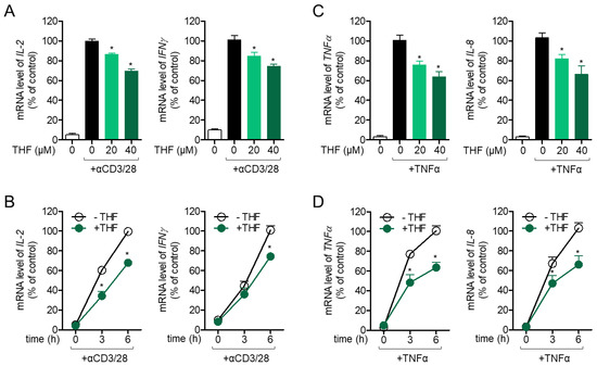 (A,B) Jurkat cells were pre-treated with the indicated concentration (0 to 40 μM) of THF (A) or 40 μM (B) for 1 h and stimulated with immobilized anti-CD3 antibodies (20 μg/mL) and soluble anti-CD28 antibodies (7 μg/mL) for 6 h (A) or the indicated time (B). The mRNA levels of IL-2 and IFNγ from the activated T cells were measured by quantitative real-time PCR. (C,D) HT-29 cells were pre-treated with the indicated concentration of THF (0 to 40 μM) (C) or 40 μM (D) for 1 h and stimulated with human TNFα recombinant protein (10 ng/mL) for 6 h (C) or the indicated time (D). The mRNA levels of TNFα and IL-8 from the activated HT-29 cells were measured by quantitative real-time PCR. The mRNA level of the indicated genes was normalized to the level of GAPDH. The mean value of three experiments ± SEM is presented. * p < 0.05 between the indicated group and mock-treated cells.