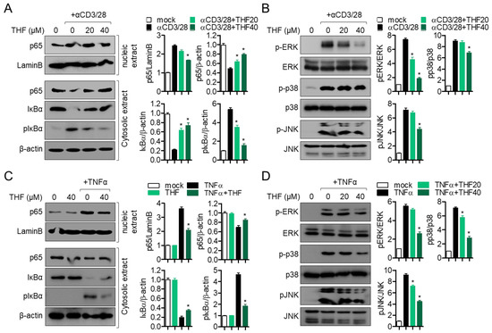 (A,B) Jurkat cells were pre-treated with the indicated concentration of THF for 1 h and stimulated with immobilized anti-CD3 antibodies (20 μg/mL) and soluble anti-CD28 antibodies (7 μg/mL) for 1 h (A) or 30 min (B). (C,D) HT-29 cells were pre-treated with 40 μM (C) or the indicated concentration (D) of THF for 1 h and stimulated with human TNFα recombinant protein (10 ng/mL) for 1 h (C) or 30 min (D). After lysis, the indicated proteins were detected by western blot analysis and normalized with LaminB for nuclear extract, β-actin for cytosolic extract, and total protein for each band of phosphorylated proteins. The mean value of three experiments ± SEM is presented. * p < 0.05 between mock-treated cells.