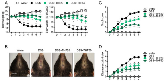 (A) Changes in the body weights of the experimental mice. (B) Representative anus pictures of each mouse group. (C) Changes in the stool scores of the experimental mice. White bar indicates 0.5 cm. (D) Changes in the disease activity index of the experimental mice. Water group: mice given drinking water, DSS group: mice given drinking water containing 2.5% DSS for seven days, DSS + THF20 group: mice given drinking water containing 2.5% DSS and orally administered 20 mg/kg THF every day for seven days, DSS + THF50 group: mice given drinking water containing 2.5% DSS and orally administered 50 mg/kg THF every day for seven days. The mean value of five mice ± SEM is presented. * p < 0.05 between the DSS and DSS + THF20 group; ** p < 0.05 between the DSS and DSS + THF50 group.