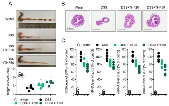 To investigate the protective effect of THF on DSS-induced colitis in more detail, colons were removed to compare their lengths, since colon length shrinkage is a typical manifestation of colitis. Figure 6A shows that colons isolated from colitis mice were diminished compared to colons from control mice, but oral administration of THF partially recovered the lengths of colons in a dose-dependent manner. The histological alteration in the intestinal structure was determined by monitoring the axial sections of colons stained with hematoxylin and eosin (H&E). Shrunken colons with crypt architecture and inflammatory cell infiltration were observed in DSS-induced colitis mice, but improved colons were observed in colitis mice with the oral administration of THF (Figure 6B). For molecular evaluation, mRNA levels of pro-inflammatory cytokines from intestinal epithelial cells were detected by quantitative PCR to determine whether the oral administration of THF inhibited inflammation in the colon. Figure 6C shows enhanced production of pro-inflammatory cytokines, including TNFα, IL-1β, IL-6, and IL-8; THF treatment partially suppressed these manifestations in colon tissues. These results demonstrate that THF administration regulates intestinal inflammation in a DSS-induced colitis model.