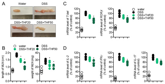 (A) Representative images of the mesenteric lymph node (MLN) from each mouse group. (B) The length and weight of the MLN from each mouse group. (C,D) mRNA levels of the indicated genes of the MLN from each mouse group. mRNA levels of the indicated genes were normalized with those of GAPDH. Water group: mice given drinking water, DSS group: mice given drinking water containing 2.5% DSS for seven days, DSS + THF20 group: mice given drinking water containing 2.5% DSS and orally administered 20 mg/kg THF every day for seven days, DSS + THF50 group: mice given drinking water containing 2.5% DSS and orally administered 50 mg/kg THF every day for seven days. The mean value of five mice ± SEM is presented. * p < 0.05 between the DSS mouse group.