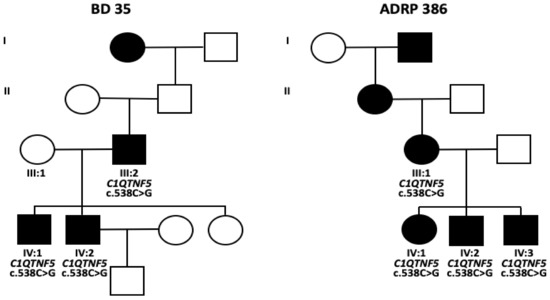 Patients III:2 and IV:2 from family BD 35 and patients IV:1 and IV:3 from family ADRP 386 underwent diagnostic genetic testing by means of whole genome sequencing. Details of sequencing and variant classification have been described previously [52]. Segregation analysis in family members was performed using conventional Sanger sequencing.