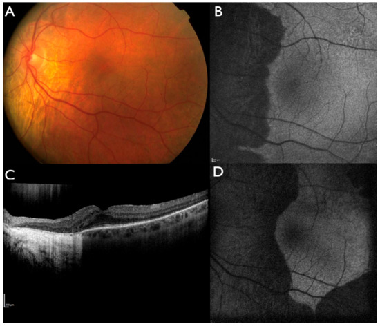 - Tsunoda, K.; Fujinami, K.; Yoshitake, K.; Iwata, T. Late-onset night blindness with peripheral flecks accompanied by progressive trickle-like macular degeneration. Doc. Ophthalmol. 2019, 139, 171–184. [Google Scholar] [CrossRef]