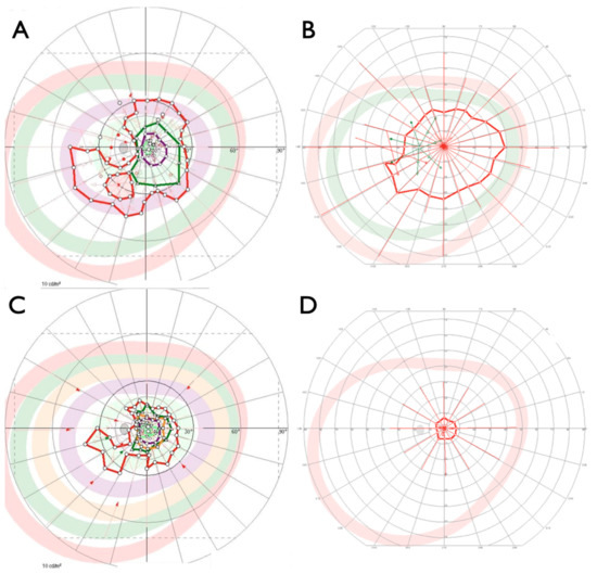 Visual fields in patient IV:1 (A), patient IV:2 (B) and patient IV:3 from family ADRP 386 at 50 (C) and 56 years of age (D). Please note that visual fields were obtained with different software and therefore cannot be displayed with the same look. Degrees are scaled similarly for all images.
