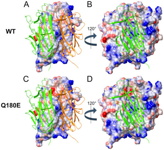 Electrostatic potential mapped on the molecular surface of a C1QTNF5 wild-type (WT) (A,B) and Q180E (C,D) homozygous trimer. Protein structure is shown in cartoon, protomer B is colored in orange, protomer C in green. The molecular surface of protomers A and B is colored in a blue-to-red scale from −0.3 to 0.3 kT/e. (A,C) Electrostatic potential of protomer A. (B,C) Electrostatic potential of protomers A and B, protein view is rotated by 120 ° counterclockwise along the symmetry axis.