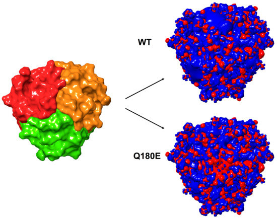 The role of residue Gln180 (in the WT protein) in protomer association was investigated by the “Protein Surface Analysis” tool. A well-performing index based on the analysis of the distribution of hydrophobic and electrostatic patches on the surface of the protein, the AggScore index [54], was calculated to estimate aggregation propensity of the protomer.