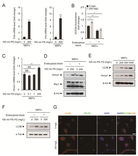 Stress response in MEFs caused by the intracellular accumulation of PS nanoplastics. (A,C) MEFs were treated with 100 nm PS nanoplastics at the indicated concentration for 2 days. mRNA expression levels of tumor necrosis factor-α (Tnfa), interleukin-1β (Il1b), and heme oxygenase1 (Hmox1) were determined by qRT-PCR (n = 3 each), normalized against Gapdh levels, and expressed as the fold change relative to untreated control levels. (B) MEFs were treated with PS nanoplastics at the indicated concentration for 1 day with or without sodium azide pretreatment to block endocytosis. ROS generation was detected using dichlorofluorescein diacetate (DCFDA)-based ROS detection assay kit. (D,F) Immunoblot detection of Hmox1, Nqo1, and LC3B in MEFs treated with PS or PS-YG at the indicated concentration for 1 day with or without sodium azide pretreatment to block endocytosis. β-Actin (β-Act) or α-tubulin (α-Tub) was used as a loading control. Asterisks (*) in Nqo1 immunoblot indicate non-specific bands. (E) Immunoblot detection of LC3B and Hmox1 in MEFs treated with PS-YG at the indicated concentration for 2 days. β-Actin (β-Act) was used as a loading control. (G) MEFs were treated with 100 nm PS-YG nanoplastics at the indicated concentration for 2 days. Cells were subjected to immunofluorescence analysis using an anti-LC3B antibody and DNA was visualized with DAPI. Direct fluorescence from PS-YG nanoplastics was also visualized. Representative immunoblots or images of cells are shown. qRT-PCR and ROS detection data are expressed as the means ± SEM from the indicated number of samples. * p < 0.05; ** p < 0.01; *** p < 0.001 vs. control (0 mg/L) or between two groups, as indicated by horizontal bars. NS, not significant. Scale bar, 50 μm.