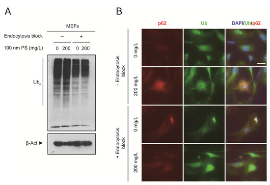 We also confirmed that the endocytosis-dependent induction of oxidative stress was caused by the exposure to PS nanoplastics as we observed increased levels of the ubiquitin (Ub) conjugates (Figure 3A). Under oxidative stress conditions, misfolded proteins accumulate and become ubiquitinated [17]. They tend to form misfolded protein aggregates and are detected as Ub conjugates. Autophagic adaptor p62-positve puncta colocalized with Ub when PS nanoplastics were allowed to enter the cells (Figure 3B). These results suggest that activated autophagy may recruit ubiquitinated substrates including misfolded protein aggregates for clearance. However, based on the accumulation of Ub conjugates in the presence of PS nanoplastics, it is highly likely that PS nanoplastics may interfere with normal autophagic function or autophagic flux inside the cells.