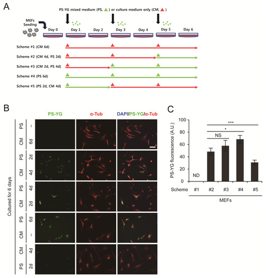 Until now, when monitoring the effect of PS nanoplastics on MEFs, we have always cultured cells in medium containing PS nanoplastics. Under these conditions, MEFs were always exposed to PS nanoplastics, and it is not known whether they could be removed from the cells because uptake via endocytosis occurred continuously. To overcome this problem, we decided to wash out PS nanoplastics from the culture medium. In this experiment, we cultured MEFs according to 5 different schemes (Figure 4A). As expected, PS nanoplastics accumulated in the cytoplasm when MEFs were exposed for 2 to 6 days (Figure 4B,C). However, after exposure to PS nanoplastics for 2 days, when PS nanoplastics were removed from the medium and cultured for another 4 days, we found a marked reduction in PS-YG fluorescence inside the cells (Figure 4B, CM 4d, PS 2d vs. PS 2d, CM 4d). These results suggest that PS nanoplastics accumulated in the cytoplasm can be removed or exported out of the cells. Although the exact mechanism for the clearance of PS nanoplastics has not yet been determined, MEFs can tolerate the presence of PS nanoplastics by activating the stress response system and by promoting the clearance of PS nanoplastics from the cytoplasm.