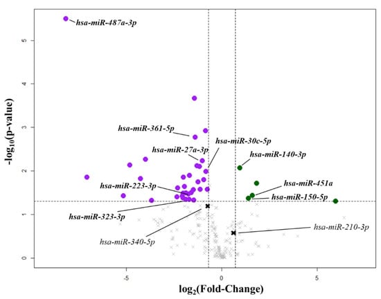 Circulating microRNAs (miRNA) linked to mitral valve prolapse. Volcano plot represents the differential expression of circulating miRNAs between healthy subjects (CTRL; n = 4) and mitral valve prolapsed patients (MVP; n = 4). The vertical lines correspond to fold changes of −0.7 (downregulation) and +0.7 (upregulation). The horizontal lines indicate a p-value of 0.05. The purple points denote downregulated miRNAs, while the green points denote the upregulated miRNAs with statistical significance in comparison to healthy subjects. The bold black crosses depict not differentially expressed miRNAs investigated in the validation phase.