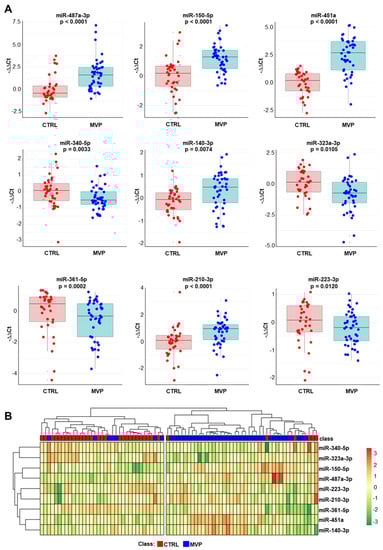Circulating miRNA validation. (A) Validation analysis confirmed that miR-487a-3p, miR-150-5p, miR-140-3p, miR-451a, and miR-210-3p were significantly upregulated in the mitral valve prolapsed group (MVP, n = 43) compared with healthy subjects (CTRL, n = 34). Instead, miR-340-5p, miR-323a-3p, miR-361-5p, and miR-223-3p were significantly downregulated in the MVP group compared with the CTRL group. Data are depicted as box-and-whisker plots of –delta–delta cycle threshold (−ΔΔCt). (B) The heatmap shows that the nine miRNAs differentially expressed in both the screening and the validation cohorts discriminated healthy subjects (CTRL; red squares) from patients with mitral valve prolapse (MVP; blue squares). MiRNAs expression levels were expressed as standardized values and displayed as a color gradient from dark red (i.e., highest expression level) to dark green (i.e., lowest expression level).