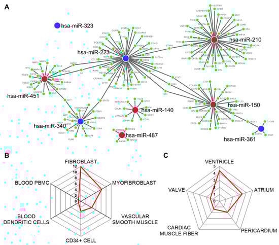 MiRNA–mRNA target prediction revealed that 171 genes are potentially modulated by the nine differentially expressed miRNAs (Figure 3A). However, since we took into account only experimental validated interactions and miR-323 did not have any, it was excluded in this analysis. The modulated mRNAs are mainly represented in fibroblast and myofibroblast and in vascular smooth muscle and CD34+ cells to a lesser extent (Figure 3B). Regarding the location of these cells, the main cardiovascular tissues involved were the heart ventricles and atriums, the pericardium, and the cardiac muscle fibers as well as the heart valves (Figure 3C).