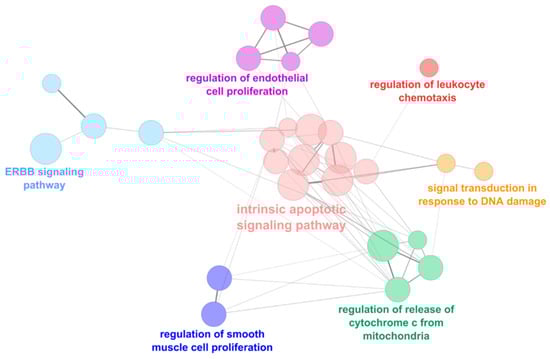 The functional analyses showed that genes regulated by these miRNAs are implicated in several cellular processes. In particular, the main downregulated processes, identified by the upregulated miRNAs, were the intrinsic apoptotic signaling pathways, the regulation of endothelial and smooth muscle cell proliferation, the signal transduction in response to DNA damage, and the erythroblastic oncogene B (ERBB) signaling pathway (Figure 4).