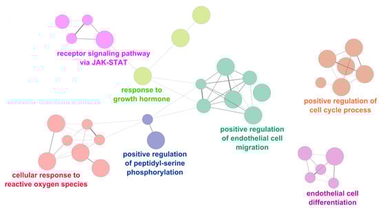 Conversely, the main upregulated processes were the cellular response to reactive oxygen species, the receptor signaling pathway via janus kinase-signal transducer and activator of transcription protein (JAK-STAT), and the regulation of endothelial cell migration and differentiation (Figure 5).