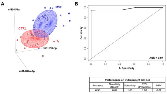 Mitral valve prolapse circulating miRNA signature robustness. (A) Scatter plot based on the most statistically significant (p < 0.001) miRNAs: miR-150-5p, -451a, and -487a-3p. The red dots represent healthy subjects (CTRL), while the blue dots represent the mitral valve prolapsed patients (MVP). (B) Performances of the classification model on an independent test set in terms of accuracy, specificity, sensitivity (i.e., recall), positive predictive value (PPV), negative predictive value (NPV; i.e., precision), and the area under the receiving operator characteristic (AUC) curve.