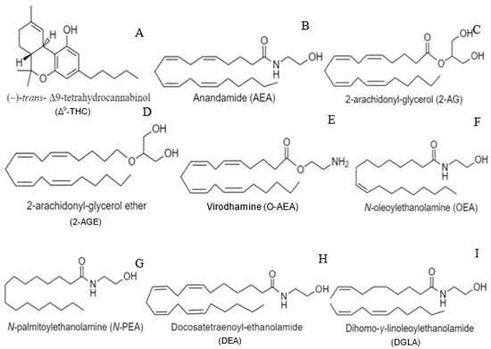Chemical structures of various cannabinoid ligands. (A) Phytocannabinoid, THC. (B,C) Endocannabinoids, AEA and 2-AG. (D–I) Synthetic cannabinoids, 2-AGE, O-AEA, OEA, N-PEA, DEA, and DGLA.