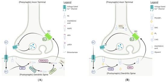 Regulation of synaptic communication is considered the canonical role of endocannabinoid signaling in the vertebrate nervous system, which occurs principally through a retrograde signaling mechanism [12,48,50]. Upon depolarization of post-synaptic neurons, increases in intracellular calcium concentrations and activation of Gq/11-coupled receptors lead to the on-demand synthesis of 2-AG and AEA from lipid precursors in the post-synaptic cell membrane [12,48,50,66]. Once synthesized, endocannabinoids move retrogradely across the synapse to bind presynaptic cannabinoid receptors; activation of presynaptic CB receptors by endocannabinoids leads to the suppression of subsequent neurotransmitter release from the presynaptic terminal [12,48,50].