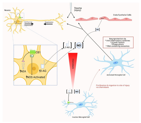 Experimental model summarizing the role of endocannabinoid signaling and nitric oxide production in the activation and chemotaxis of microglia after nervous system injury in the leech. CNS injury elicits an increase in nitric oxide synthase activity in both endo- and epithelial cells, as well as damaged neurons. NO diffuses away from the injury site to promote the concentration-dependent directed movement of activated microglia to the damaged area. At the same time, activation of anabolic enzymes in damaged neurons leads to the increased production of the endocannabinoids AEA and 2-AG. AEA can act in an autocrine manner through CB1-like receptors on neurons to increase the production of NO at the lesion site as well as promote neurite growth. 2-AG, at the same time, acts as a chemoattractant for microglia via CB2-like receptors on the lamellipodia of these immunomodulatory cells. Activated microglia accumulate at the lesion site and provide neuroprotection with the release of anti-inflammatory cytokines, growth factors and RNA-containing exosomes as well as phagocytic activity to clean up cellular debris. (With contributions from [101,102]. [Created with Bio-render, BioRender.com (accessed on 21 January 2021).]