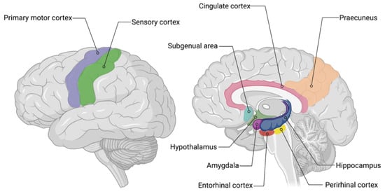 Regions affected by Alzheimer’s disease. Figure created with www.BioRender.com (accessed on 12 February 2021).