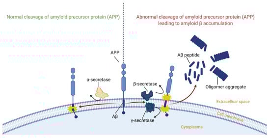 Accumulation of amyloid-β in AD. Figure adapted from Patterson et al. [89] and created with www.BioRender.com (accessed on 16 November 2020).