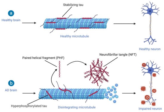 Tau protein aggregation leads to formation of neurofibrillary tangles in AD. (a) Role of tau protein in healthy brain; (b) role of tau protein in Alzheimer’s disease brain. NFT: neurofibrillary tangles; PHF: paired helical filaments. Figure adapted from “Pathology of Alzheimer’s Disease”, by BioRender.com (2020). Retrieved from https://app.biorender.com/biorender-templates (accessed on 16 November 2020).