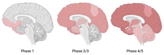 Tau spreading pattern in each Braak stage. Spreading pattern of tau throughout the brain from Braak stage I-II to stage III-IV (limbic regions) and stage V-VI (isocortical areas). Figure adapted from Goedert [145] and created with www.BioRender.com (accessed on 11 February 2021).