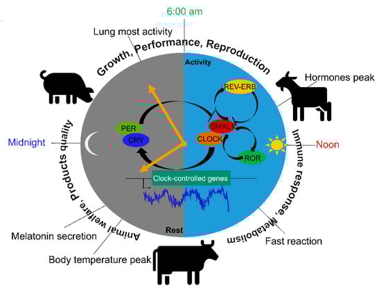 Circadian rhythms are endogenous autonomous oscillators of physiological activities. They are controlled by the circadian clock directly or indirectly in a 24 h cycle []. It is a deeply implemented system during evolution in living organisms for adaptation to a cyclic natural environment []. For instance, the metabolic processes synchronizing to the biological clock allows animals to ramp up the necessary functions for the upcoming feeding and adapt to changes in the length of the day and night. In addition to ambient light and food availability, the circadian system is also important in mediating the timing of seasonal reproduction and other yearly physiological fluctuations that are regulated by day-length. This is extremely relevant in livestock science, where we purposely manipulate the photoperiod for production and management. However, the effects on animal health and ecology are often overlooked.