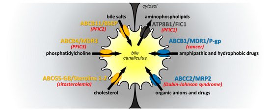 One of the liver’s main functions is bile production and secretion. In addition to its digestive function, bile plays an important role in detoxification. Bile secretion is mediated by several ATP-binding cassette (ABC) transporters, which are expressed at the canalicular membrane of hepatocytes. The main canalicular ABC transporters are the bile salt export pump (BSEP, ABCB11), which transports bile acids (BAs), ABCB4 also known as multidrug resistance protein 3 (MDR3) translocating phosphatidylcholine (PC) and ABCG5/G8 excreting cholesterol [1]. BA, PC and cholesterol form mixed micelles in the aqueous environment of bile. In addition to these compounds, bile contains a wide variety of drugs and organic anions, which are secreted by ABCB1, also known as multidrug resistance protein 1 (MDR-1, or P-glycoprotein) and ABCC2 (multidrug resistance-associated protein 2, MRP2), respectively [2,3]. ABC transporters share a common basic architecture and similar ATP-driven functions. They are organized in two repeats, each containing a membrane-spanning domain (MSD) with six transmembrane (TM) helices and a cytoplasmic nucleotide-binding domain (NBD), those two moieties being connected by an intracellular linker. The MSDs ensure substrate recognition and translocation, whereas NBDs, which are highly conserved among all ABC transporters, provide the energy for this process [3]. In contrast to other canalicular ABC transporters, ABCG5 and ABCG8 are half transporters that require heterodimerization to ensure their function, and ABCC2 has a third MSD at its N-terminus [4]. The key role of canalicular ABC transporters in bile secretion is highlighted by their implication in a wide range of diseases such as cholestasis (ABCB4, ABCB11), sitosterolemia (ABCG5/G8), Dubin–Johnson syndrome (ABCC2) and cancer (ABCB1) (Figure 1) [3]. To develop new therapies for patients with diseases related to deficient canalicular ABC transporters, it is crucial to better understand the molecular mechanisms regulating the traffic and function of these transporters. Several studies have reported that the biosynthesis, trafficking and activity of ABC transporters are regulated by numerous molecular partners, most of which have been identified by two-hybrid screens using liver banks [3]. Targeting these interactors represents a potential therapeutic option for patients. This review focuses on molecular regulators of canalicular ABC transporters involved in bile formation.
